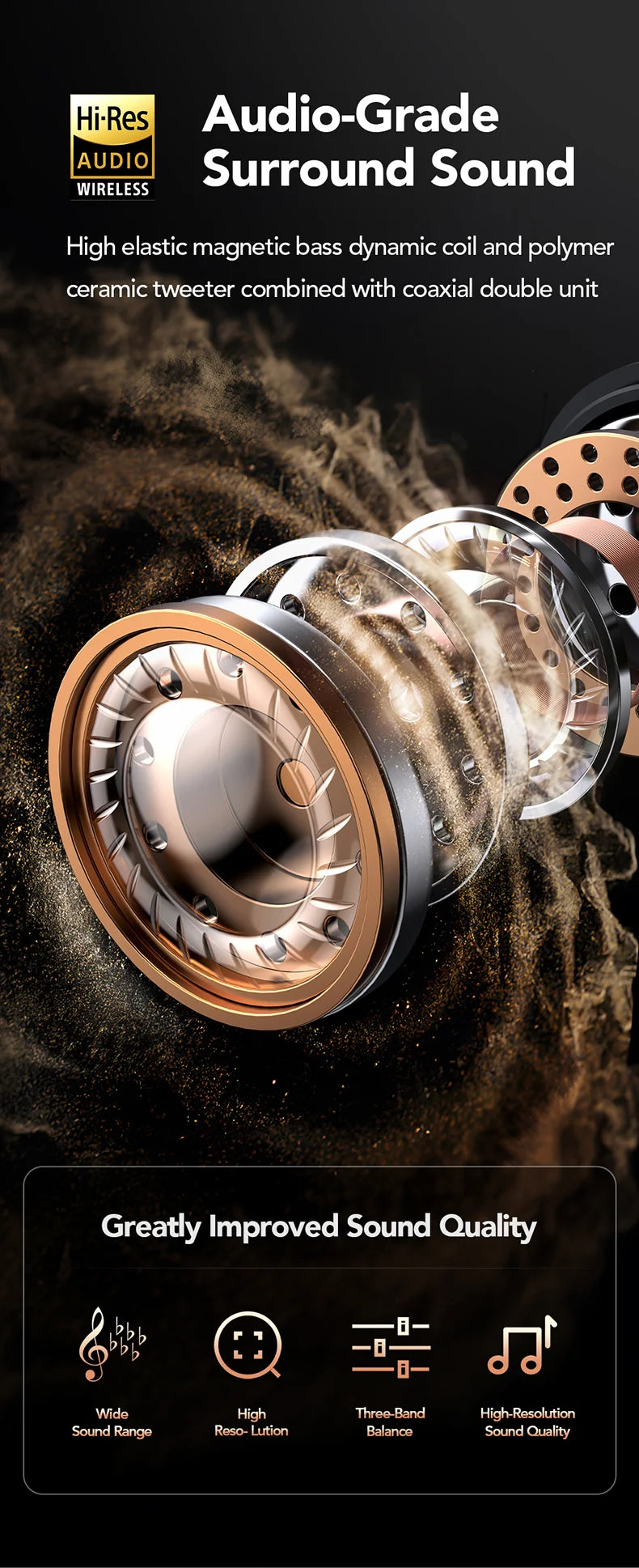 Adaptive EQ (AI-Powered): Smart audio optimization that automatically analyzes and adjusts sound output based on the unique structure of the user's ear.